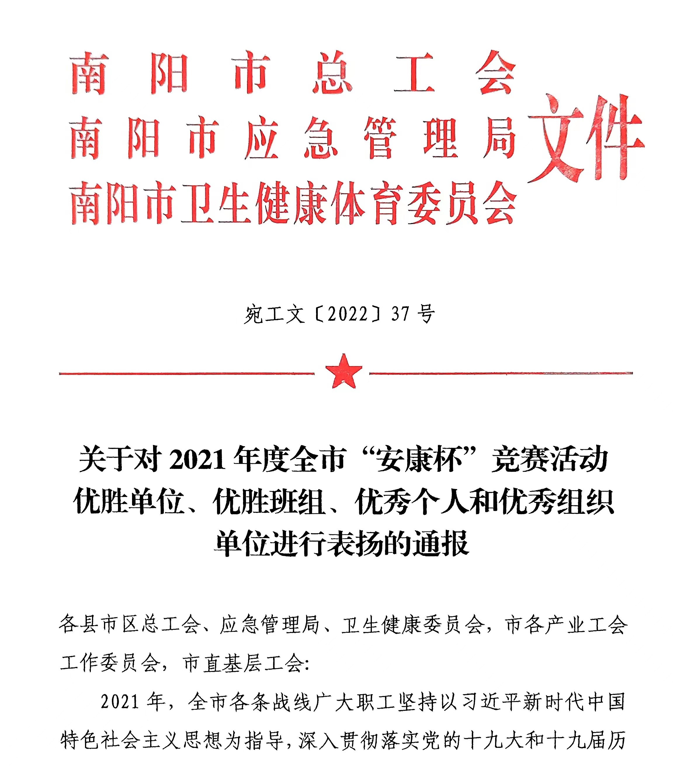 凱達(dá)環(huán)境榮獲南陽(yáng)市2021年“安康杯”競(jìng)賽優(yōu)勝單位榮譽(yù)稱(chēng)號(hào)